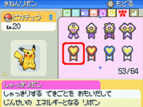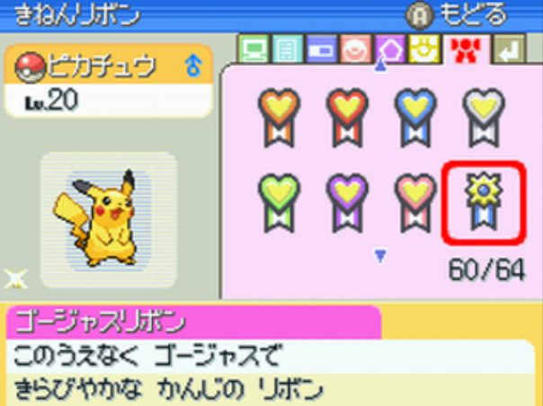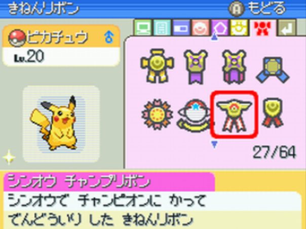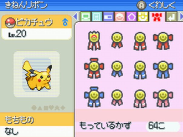 4世代のコンテストでは技が1つしかないポケモンは出場出来ず、メタモン・アンノーンは取得不可。 RSEで取得できる同名のリボンとは異なる。 6世代以降ではおもいでコンテストリボン1個に変化する。 |