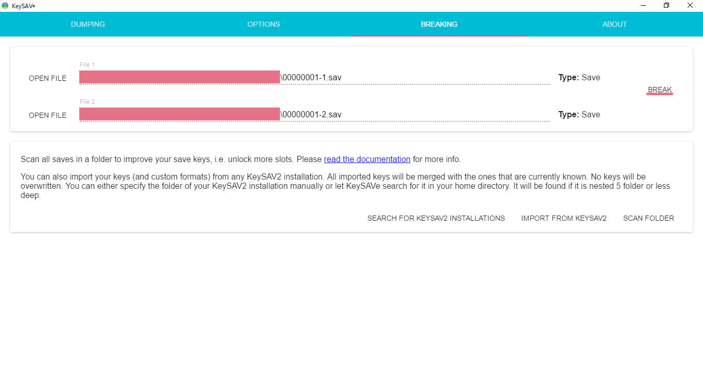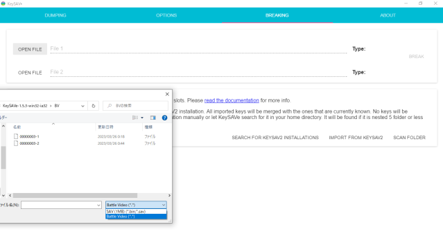 10. KeySAVe.exeを開き、上部のBREAKINGを開く。OPENFILEを押し、File1,2にそれぞれ00000001.savの(-1,-2)を選択する。