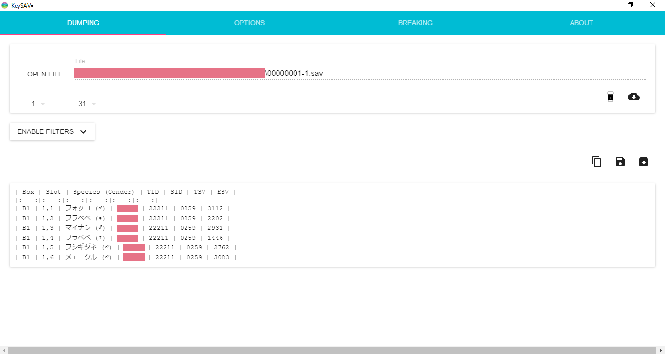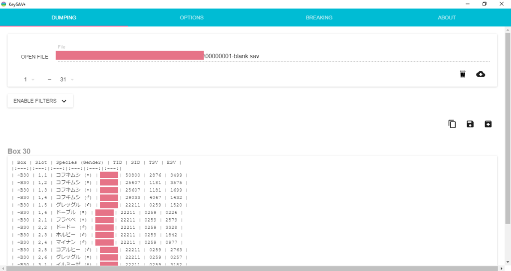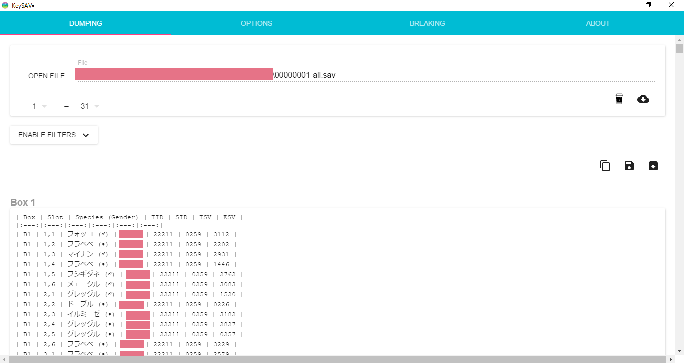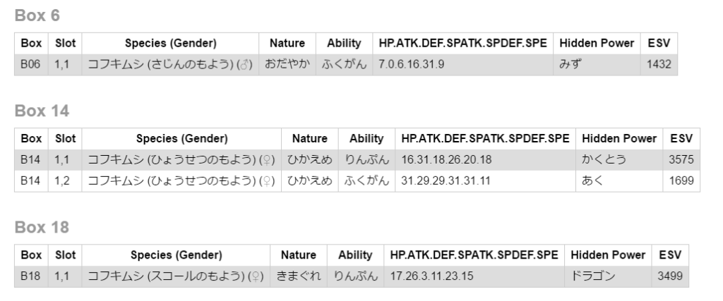 ※筆者はボックス31が解禁されていない(ゼルネアス/イベルタル戦まで進めていない)データで作業を行っているため、ボックス1~30までの情報は問題なく表示されるようになりましたが、今後ボックス31が解禁された際にボックス31の情報を読み取ることができるかは不明です‥‥