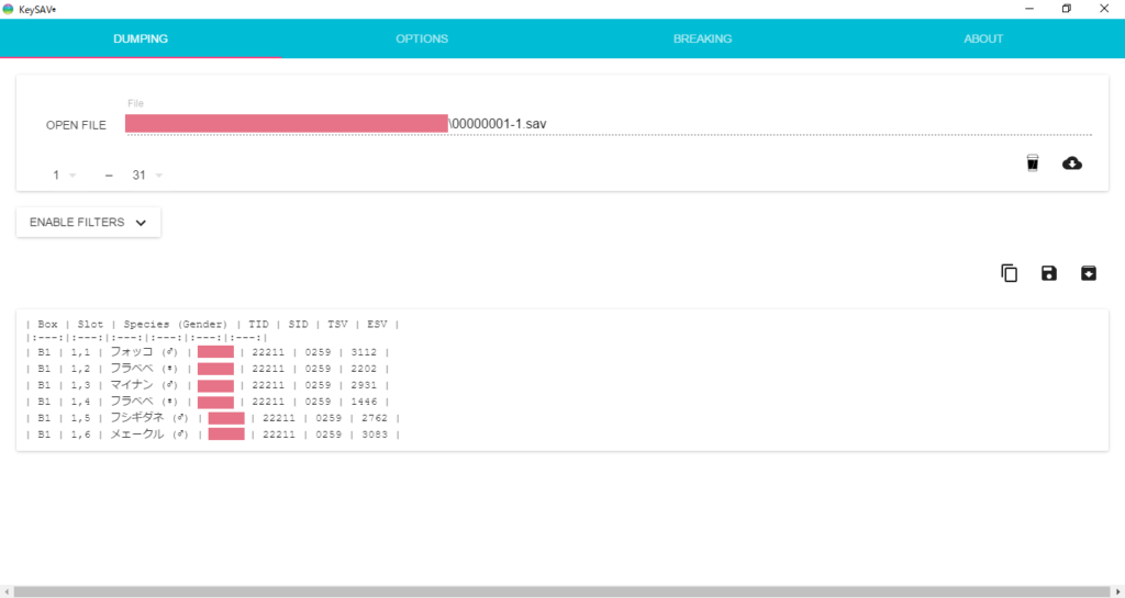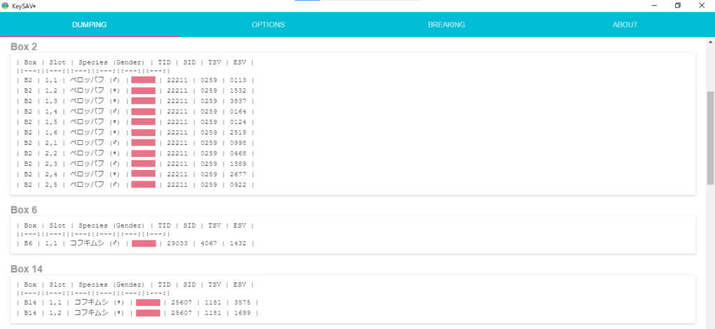 次回からは、今回使用したソフトであればTSV等を特定したいポケモンがパソコンの中にいる状態でレポートをかき、準備の際と同じ要領で00000001.savをDUMPINGで読み込むことでキーを作成した箇所にいるポケモンのTSV等が特定できる。このときも、00000001.savは必ずコピーし、他の場所に貼り付けること。