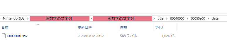 Nintendo 3DS→英数字の文字列→英数字の文字列→title→00040000→【作業するソフトのフォルダ】→data