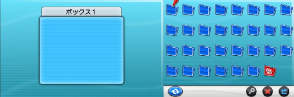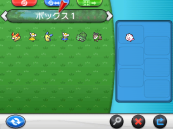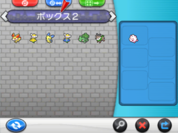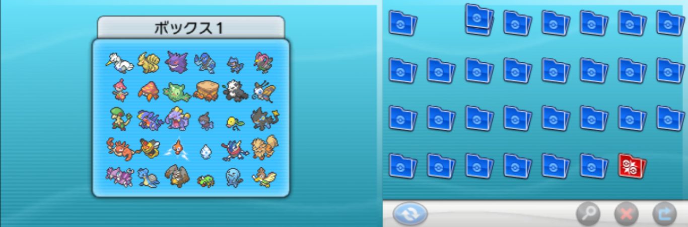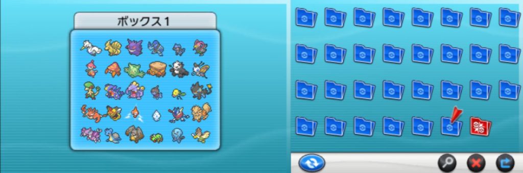 2. ボックス1に特定するソフトがおやである適当なポケモン6匹を上から順に詰めて並べ、ボックス1を開いたまま閉じる。ボックス2は空のままにしておく。準備が出来たらレポートをかき、一度L+R+Selectでリセットする。そのままゲームを開始し、その場で再度レポートをかいてからゲームを終了する。