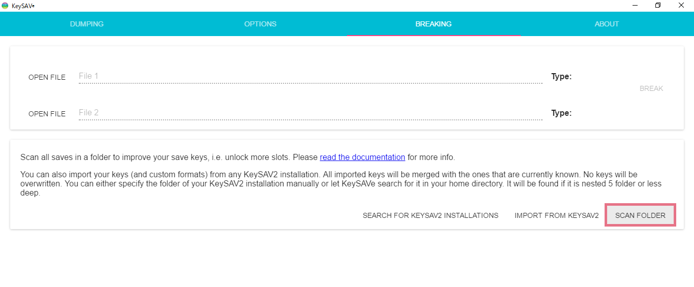 7. 上部のBREAKINGに移動し、右下のSCAN FOLDERから 00000001-blank.sav、00000001-all.sav 等を置いているフォルダを選択する。